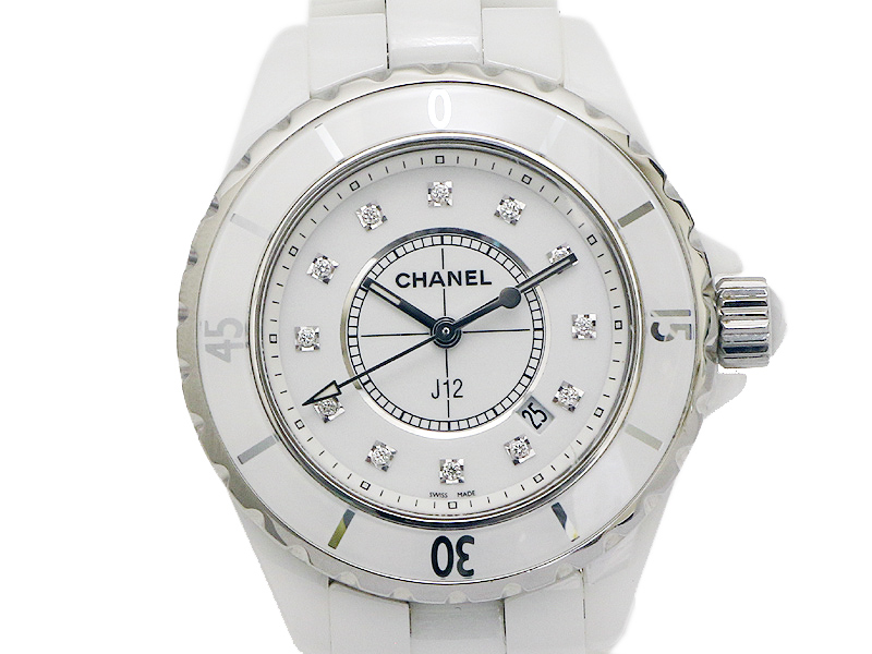 【CHANEL シャネル】J12 H1628 白セラミック 12Pダイヤ 33mm デイト クォーツ レディース