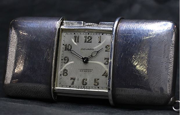 1926年に発表したスイスの名門モバード社製のトラベルウォッチの代表格「エルメイト」は従来の懐中時計ちは一線を画す大胆なデザインの時計。視認性のよいアラビア数字の文字盤にスペード針を採用しておりアンティークウォッチらしい時計で当時の流行の最先端といわれた。後にケースを左右に開閉するだけで自動的にゼンマイを巻き上げるユニークな機構モデルも開発した。