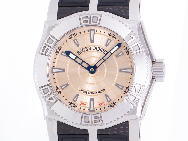 「アクアマーレ」。スクエア型のインパクトのあるケースデザインが特徴のモデルです。スクエアケースのゴールデンスクエアから派生したスポーツ・アクティビティウォッチでダイバーズウォッチ仕様のイージーダイバーとは差別化を図る意味合いで刻印されています。逆回転防止ベゼルを備えるラウンドケースに比べて不利といわれていた防水性も、イージーダイバーなどと同様の300Mを確保しており重厚感のあるスチール製ケースは、半光沢のヘアライン仕上げと磨き上げられたポリッシュの対比が美しいです。全てのモデルが限定生産品であるロジェ・デュブイは、現在、ボーム&メルシエなど多数の高級時計ブランドが傘下に入る、リシュモングループの一員となっています。